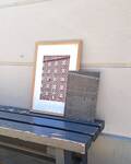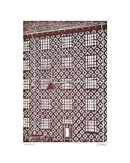 Håndlavet linoleumstryk med Linoleumshuset på Nørrebro som motiv